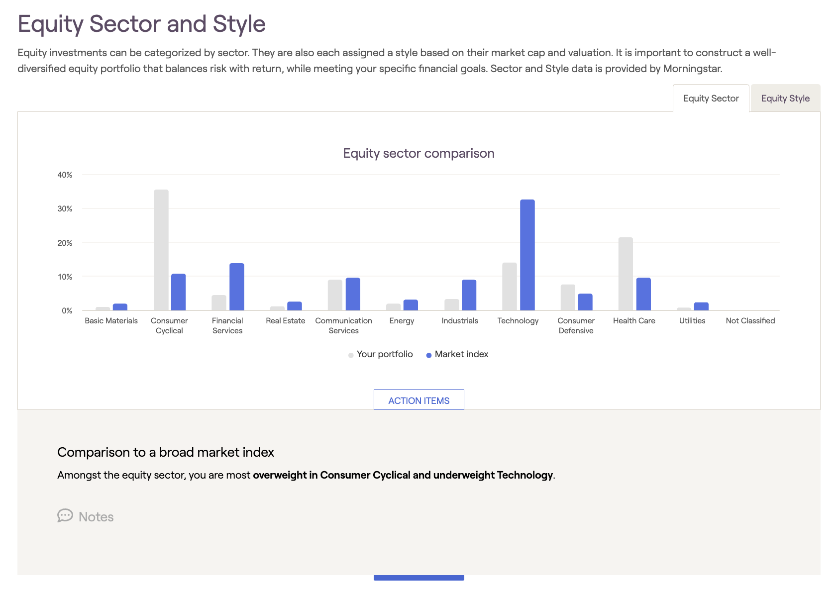 He then reviews style/sector exposures relative to the broad market to check diversification. The current portfolio appears under-weighted to technology and over-weighted to consumer cyclicals versus the market—acceptable only if intentional; otherwise it introduces uncompensated tracking risk.