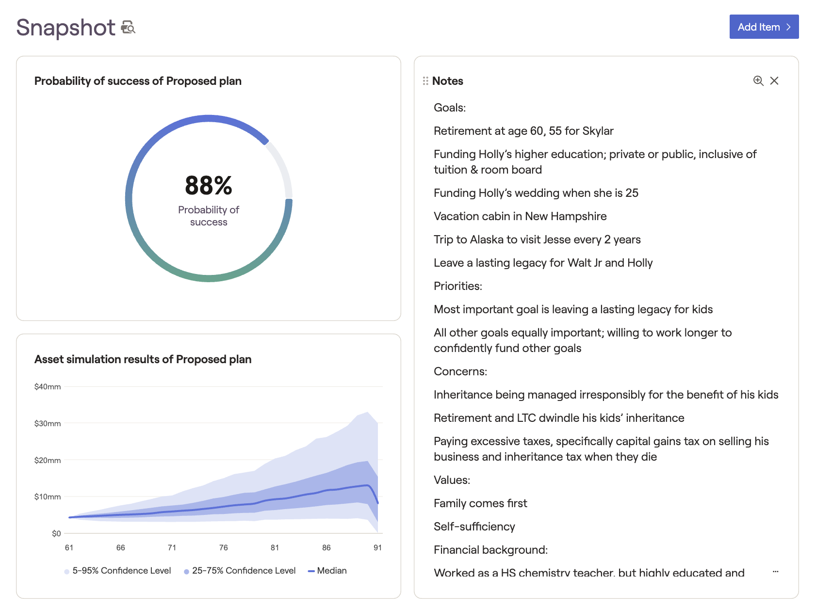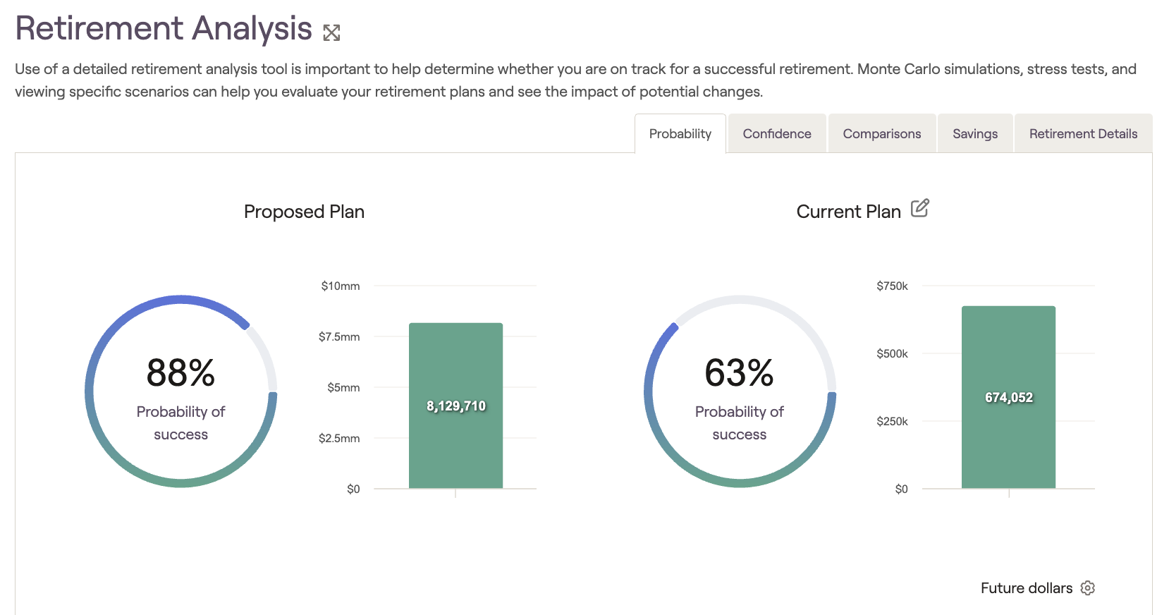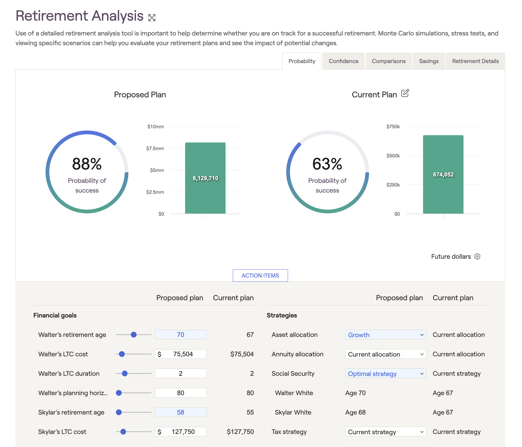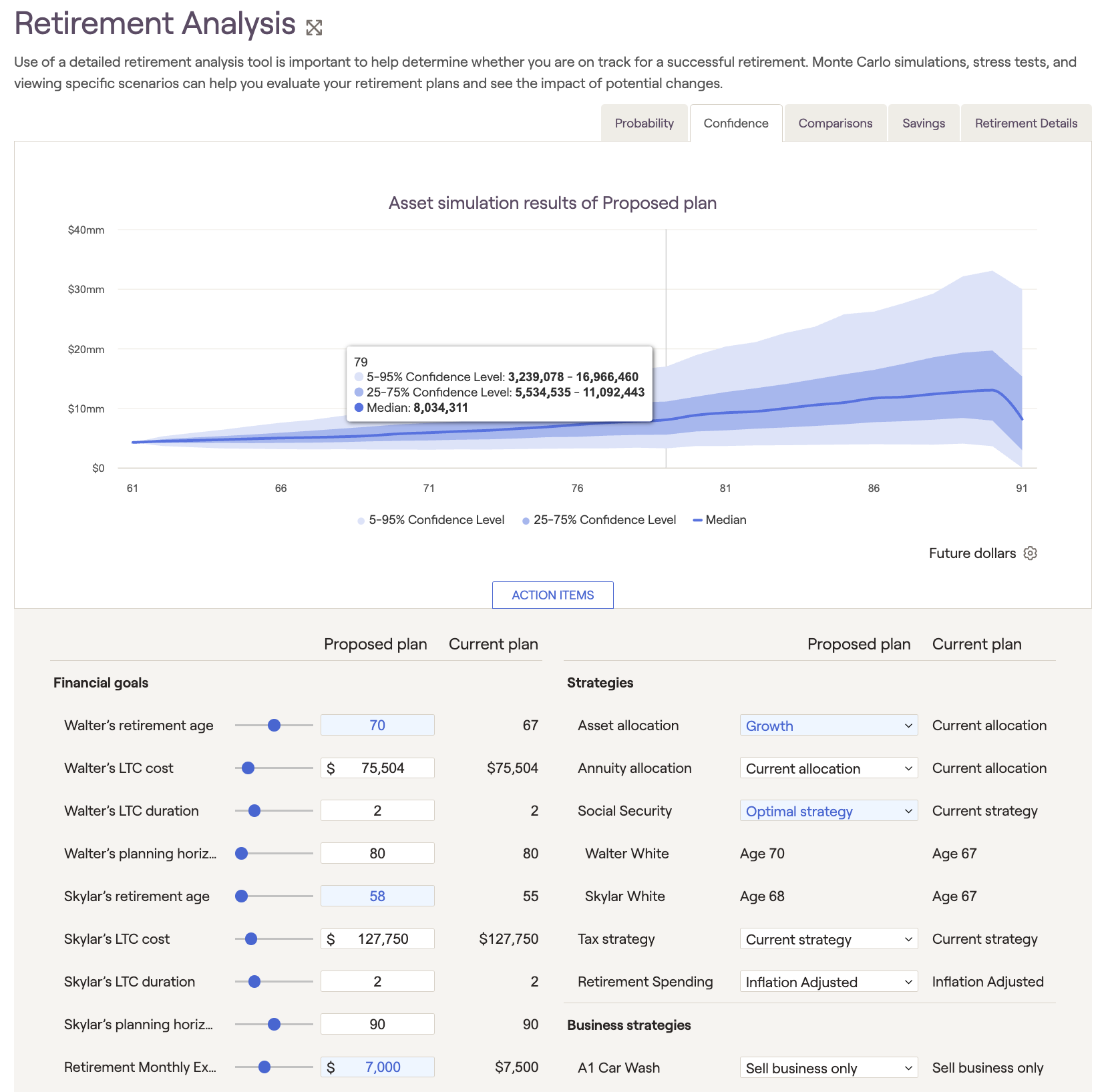 With their Monte Carlo probability of success at 63%, Daniel identified several levers to improve Walter and Skylar’s plan while staying true to their goals and values. Since their top priority is leaving a $5M legacy, while retirement timing and spending are more flexible, the recommendations focused on optimizing income strategies, reducing idle cash, and considering modest lifestyle adjustments.