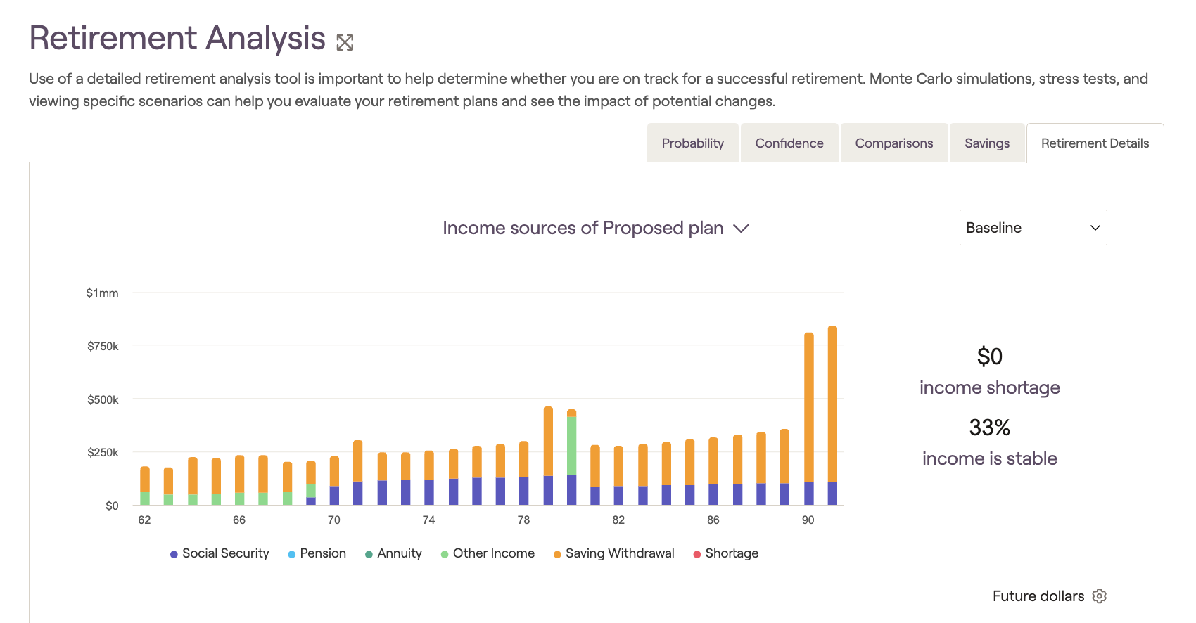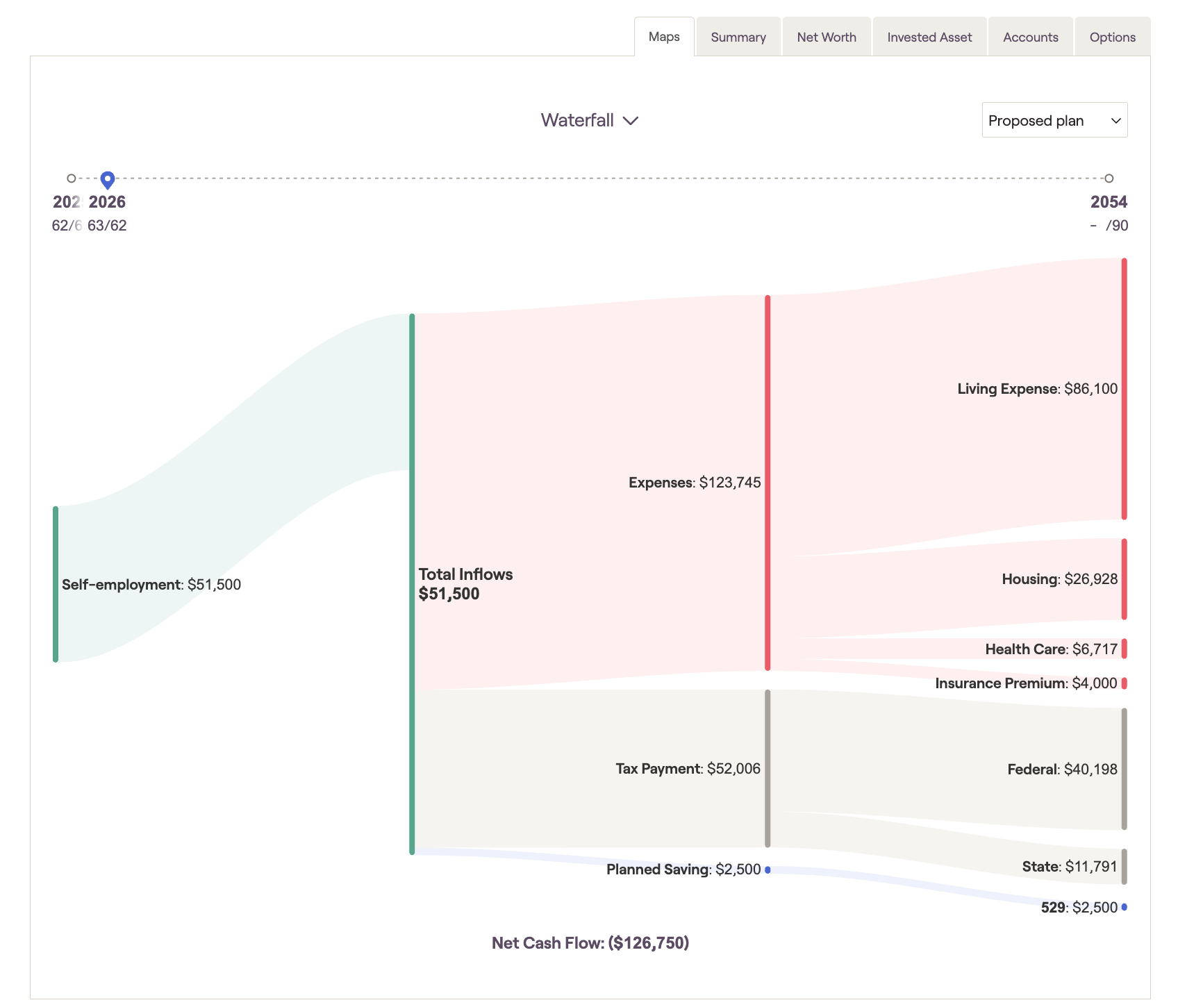 Cash Flow analysis provides Walt and Skylar with a clear, year-by-year view of how money moves through their plan. It shows their income from Social Security, portfolio withdrawals, and other sources alongside their spending, taxes, and savings, revealing each year’s net cash flow—whether they’re building reserves or drawing down assets. This helps them see how their income and expenses shift before and after retirement, ensuring they stay on track for long-term stability.