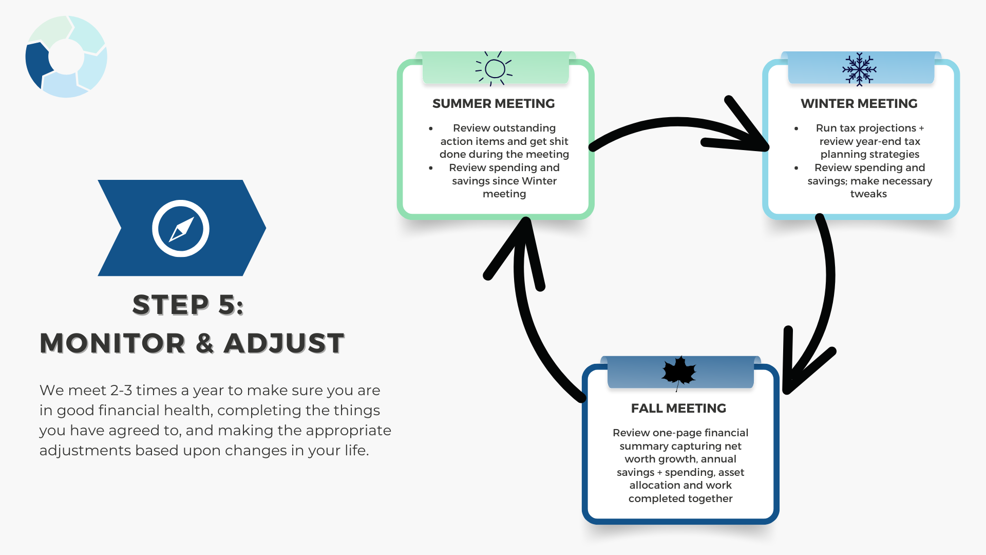 - Markets, tax laws, family dynamics, health, values—all change; the plan should, too.