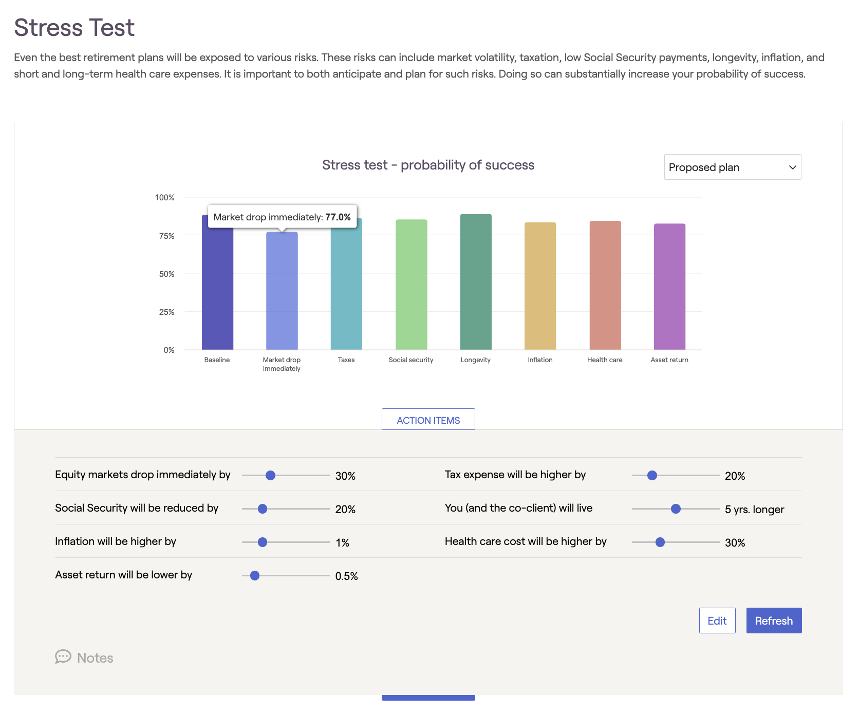 Daniel then stress tests to see how their plan holds up under adverse conditions—such as a major market downturn, higher inflation, or unexpected healthcare costs. By isolating and testing each scenario, he shows how these risks could affect their probability of success and long-term cash flow. This helps Walt and Skylar see which factors have the greatest impact and where adjustments—like reducing spending or shifting investment strategy—could strengthen their plan’s resilience.
